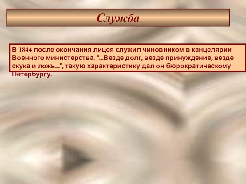 "...Везде долг, везде принуждение, везде скука и ложь...", такую характеристику дал он бюрократическому Петербургу.