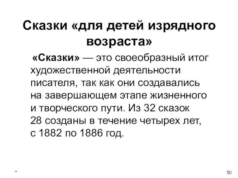итог художественной деятельности писателя, так как они создавались на завершающем этапе жизненного и творческого пути. Из 32 сказок 28 созданы в течение четырех лет, с 1882 по 1886 год.