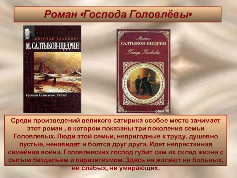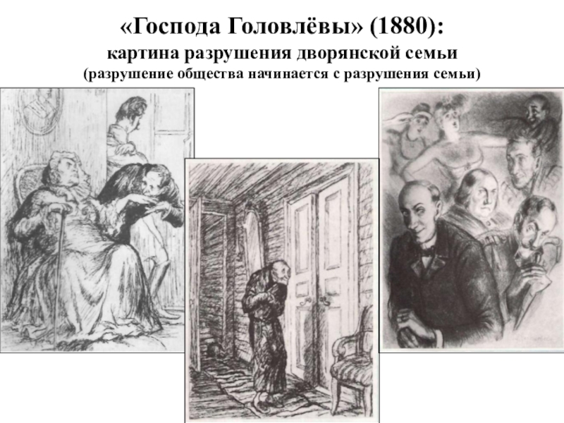 , в котором показаны три поколения семьи Головлевых. Люди этой семьи, непригодные к труду, душевно пустые, ненавидят и боятся друг друга. Идет непрестанная семейная война. Головлевских господ губит сам их склад жизни с сытым бездельем и паразитизмом. Здесь не жалеют ни больных, ни слабых, ни умирающих.
