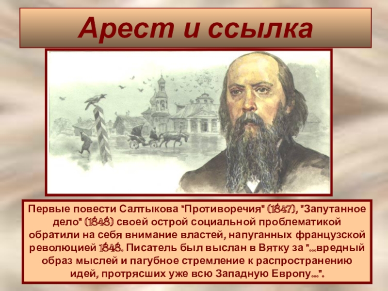 острой социальной проблематикой обратили на себя внимание властей, напуганных французской революцией 1848. Писатель был выслан в Вятку за "...вредный образ мыслей и пагубное стремление к распространению идей, протрясших уже всю Западную Европу...".