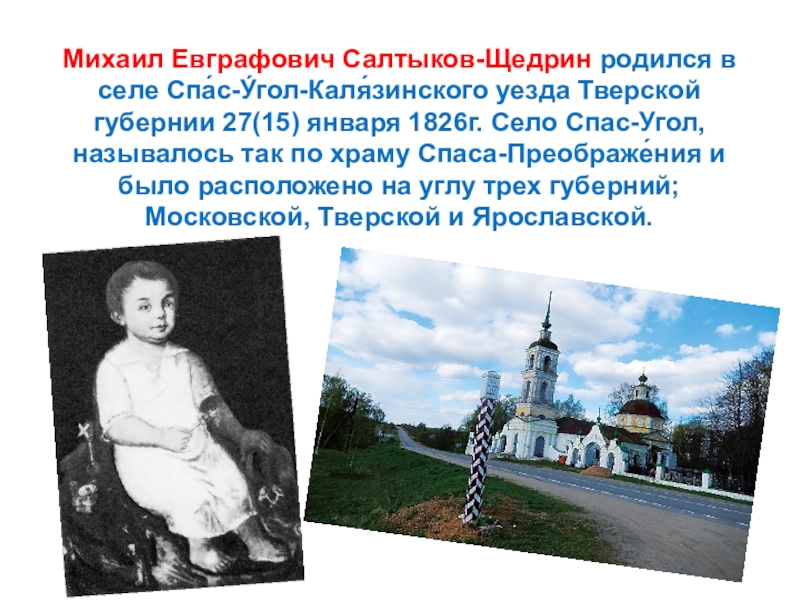 Слайд 3Михаил Евграфович Салтыков-Щедрин родился в селе Спа́с-У́гол-Каля́зинского уезда Тверской губернии 27(15)