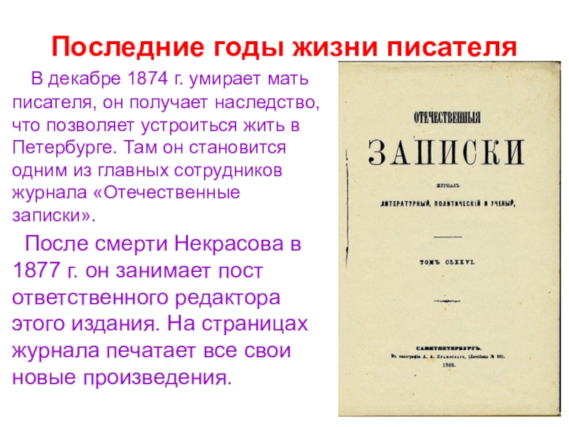 писателя, он получает наследство, что позволяет устроиться жить в Петербурге. Там он становится одним из главных сотрудников журнала «Отечественные записки».