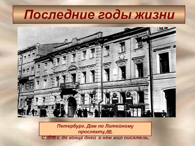 28 апреля) 1889 в Петербурге, незадолго до смерти начав работу над новым произведением "Забытые слова". Погребен 2 мая (по старому стилю), согласно его желанию, на Волковом кладбище, рядом с И.С. Тургеневым .