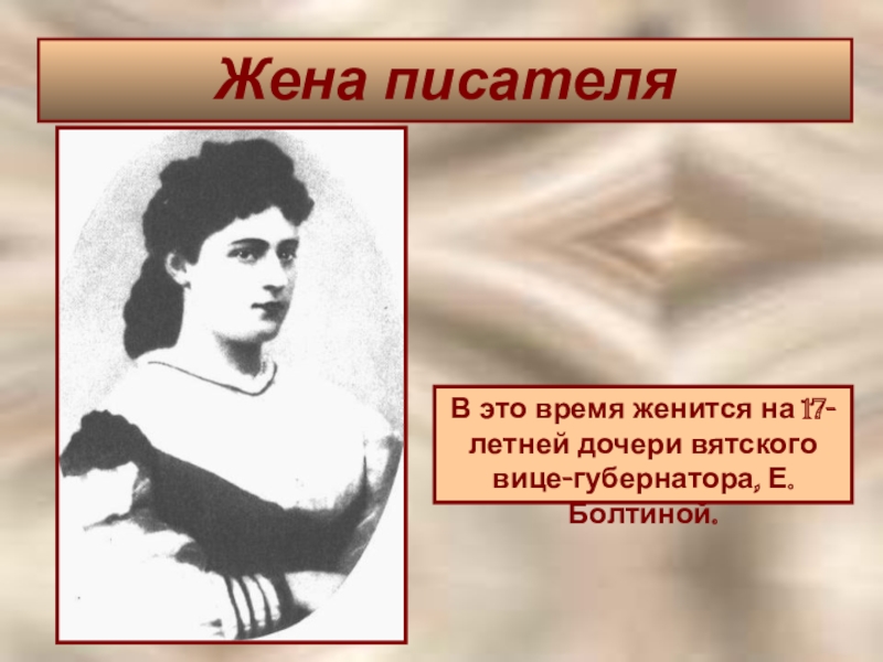 Слайд 23Свою будущую жену Елизавету Болтину, дочь Вятского вице-губернатора, Салтыков встретил, находясь