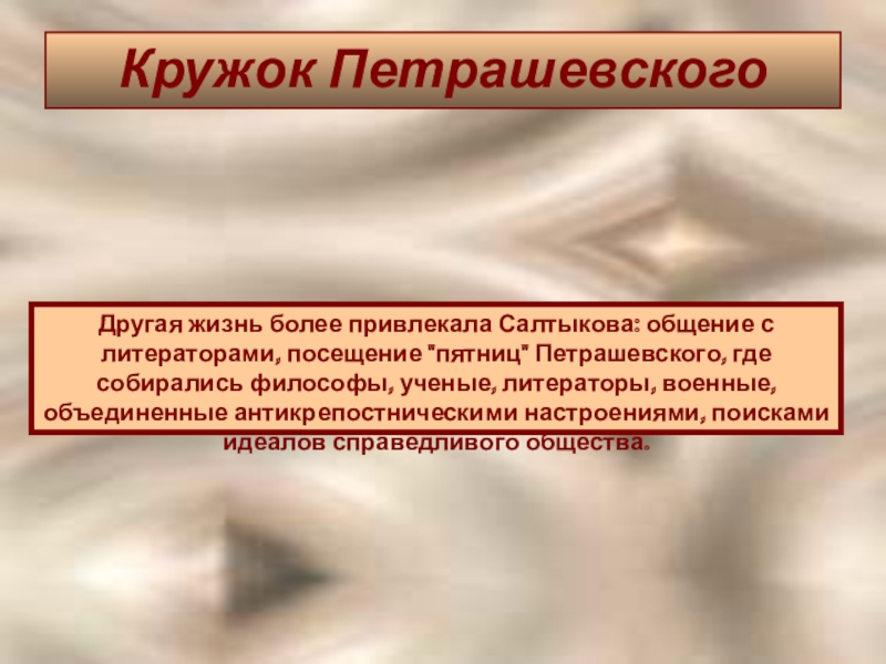 Петрашевского, где собирались философы, ученые, литераторы, военные, объединенные антикрепостническими настроениями, поисками идеалов справедливого общества.