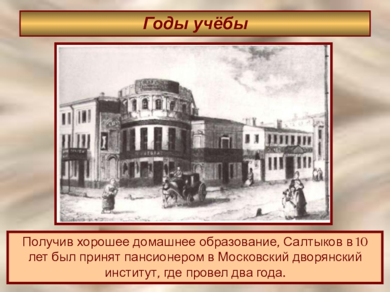 Получив хорошее домашнее образование, Салтыков в 10 лет был принят
