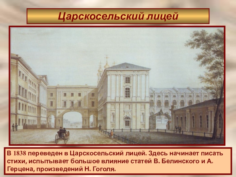 В 1838 переведен в Царскосельский лицей. Здесь начинает писать стихи,