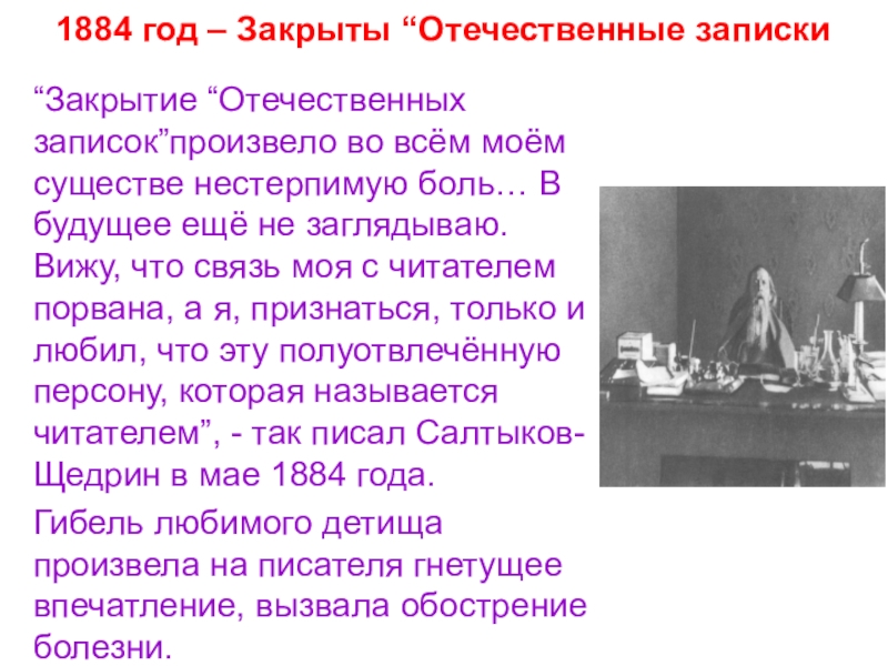 существе нестерпимую боль… В будущее ещё не заглядываю. Вижу, что связь моя с читателем порвана, а я, признаться, только и любил, что эту полуотвлечённую персону, которая называется читателем”, - так писал Салтыков-Щедрин в мае 1884 года.