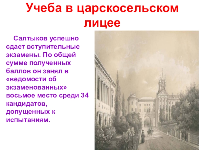 экзамены. По общей сумме полученных баллов он занял в «ведомости об экзаменованных» восьмое место среди 34 кандидатов, допущенных к испытаниям.