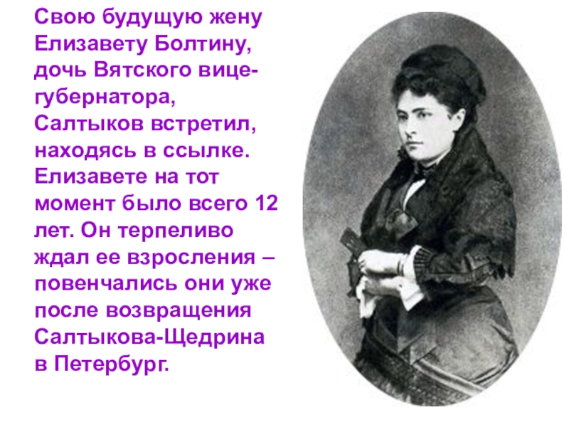в ссылке. Елизавете на тот момент было всего 12 лет. Он терпеливо ждал ее взросления – повенчались они уже после возвращения Салтыкова-Щедрина в Петербург.
