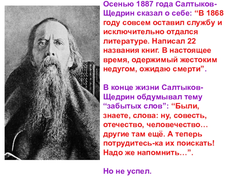 Слайд 56Осенью 1887 года Салтыков-Щедрин сказал о себе: “В 1868 году совсем
