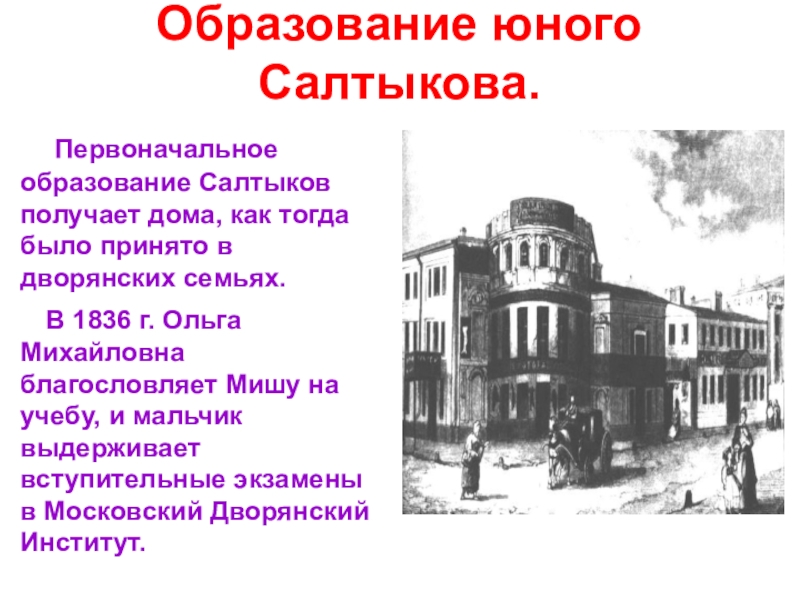 В 1836 г. Ольга Михайловна благословляет Мишу на учебу, и мальчик выдерживает вступительные экзамены в Московский Дворянский Институт.