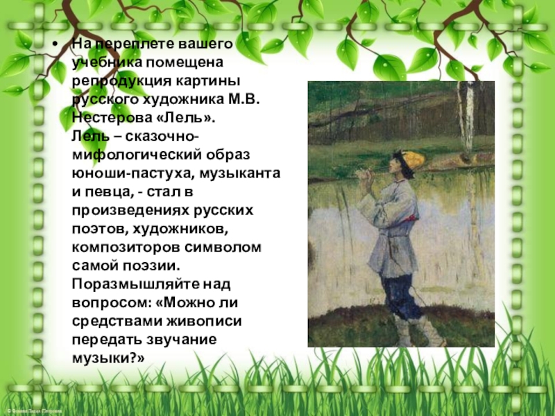 На переплете вашего учебника помещена репродукция картины русского художника М.В.Нестерова «Лель».  Лель – сказочно-мифологический образ юноши-пастуха,