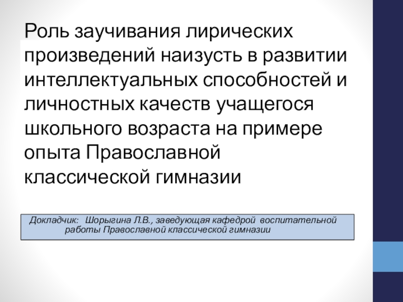 Докладчик: Шорыгина Л.В., заведующая кафедрой воспитательной работы Православной классической гимназии