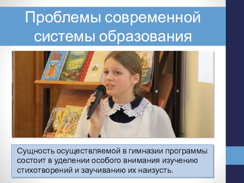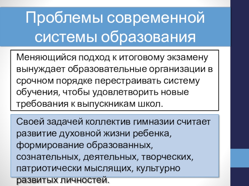 Своей задачей коллектив гимназии считает развитие духовной жизни ребенка, формирование образованных, сознательных, деятельных, творческих, патриотически мыслящих, культурно развитых личностей.