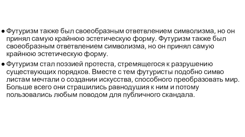 Слайд 8Футуризм также был своеобразным ответвлением символизма, но он принял самую крайнюю
