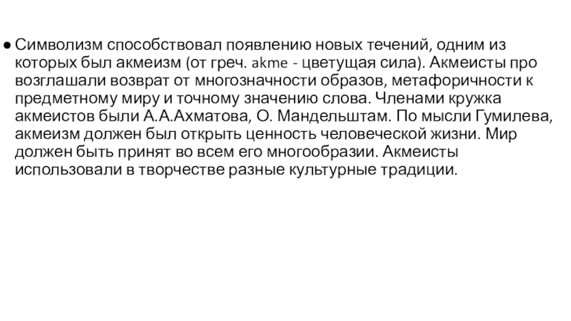 Слайд 7Символизм способствовал появлению новых течений, одним из которых был акмеизм (от