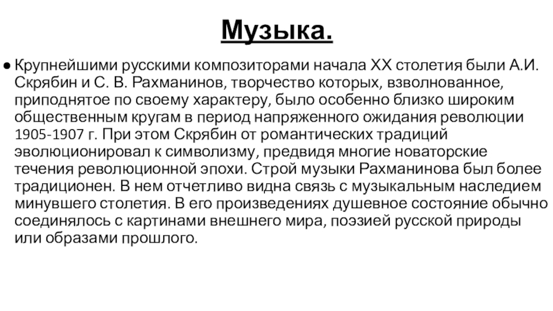 В. Рахманинов, творчество которых, взволнованное, приподнятое по своему характеру, было особенно близко широким общественным кругам в период напряженного ожидания революции 1905-1907 г. При этом Скрябин от романтических традиций эволюционировал к символизму, предвидя многие новаторские течения революционной эпохи. Строй музыки Рахманинова был более традиционен. В нем отчетливо видна связь с музыкальным наследием минувшего столетия. В его произведениях душевное состояние обычно соединялось с картинами внешнего мира, поэзией русской природы или образами прошлого.