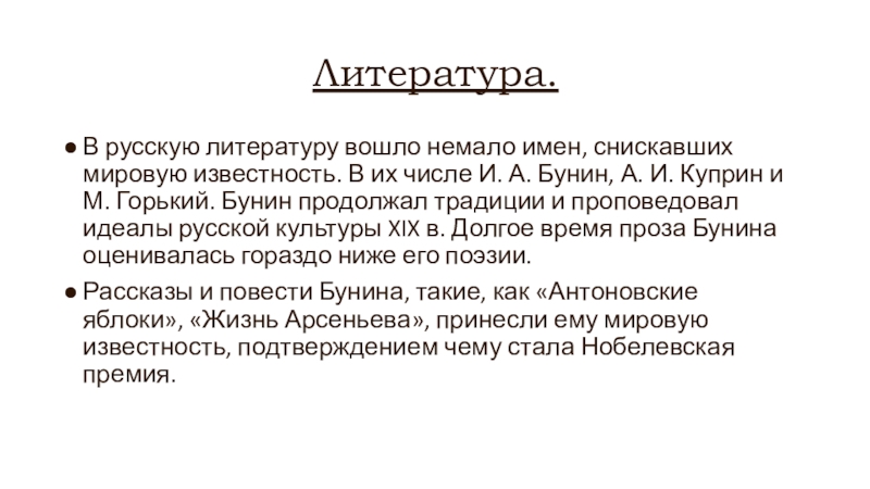 числе И. А. Бунин, А. И. Куприн и М. Горький. Бунин продолжал традиции и проповедовал идеалы русской культуры XIX в. Долгое время проза Бунина оценивалась гораздо ниже его поэзии.