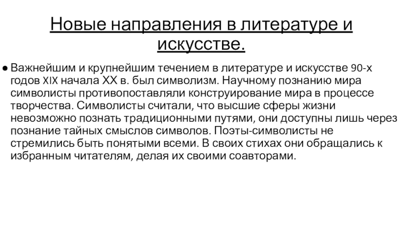 и искусстве 90-х годов XIX начала ХХ в. был символизм. Научному познанию мира символисты противопоставляли конструирование мира в процессе творчества. Символисты считали, что высшие сферы жизни невозможно познать традиционными путями, они доступны лишь через познание тайных смыслов символов. Поэты-символисты не стремились быть понятыми всеми. В своих стихах они обращались к избранным читателям, делая их своими соавторами.