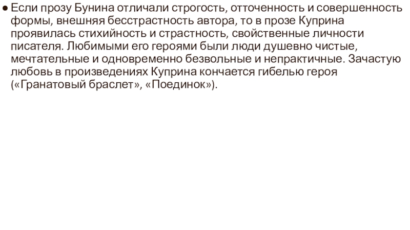 Слайд 5Если прозу Бунина отличали строгость, отточенность и совершенность формы, внешняя бесстрастность