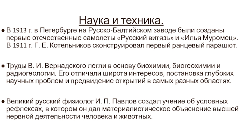 созданы первые отечественные самолеты «Русский витязь» и «Илья Муромец». В 1911 г. Г. Е. Котельников сконструировал первый ранцевый парашют.