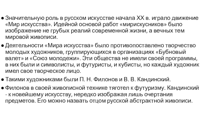 Такими художниками были П. Н. Филонов и В. В. Кандинский.