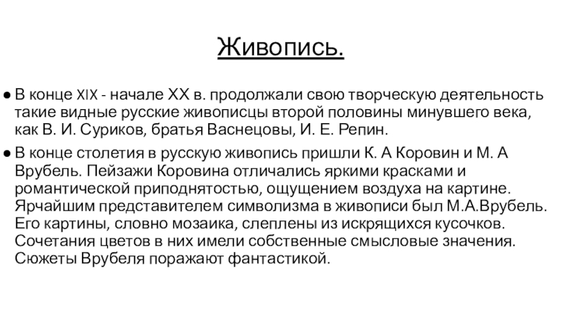 В конце столетия в русскую живопись пришли К. А Коровин и М. А Врубель. Пейзажи Коровина отличались яркими красками и романтической приподнятостью, ощущением воздуха на картине. Ярчайшим представителем символизма в живописи был М.А.Врубель. Его картины, словно мозаика, слеплены из искрящихся кусочков. Сочетания цветов в них имели собственные смысловые значения. Сюжеты Врубеля поражают фантастикой.