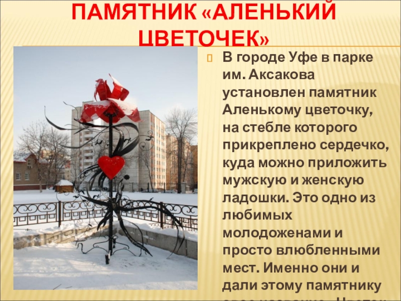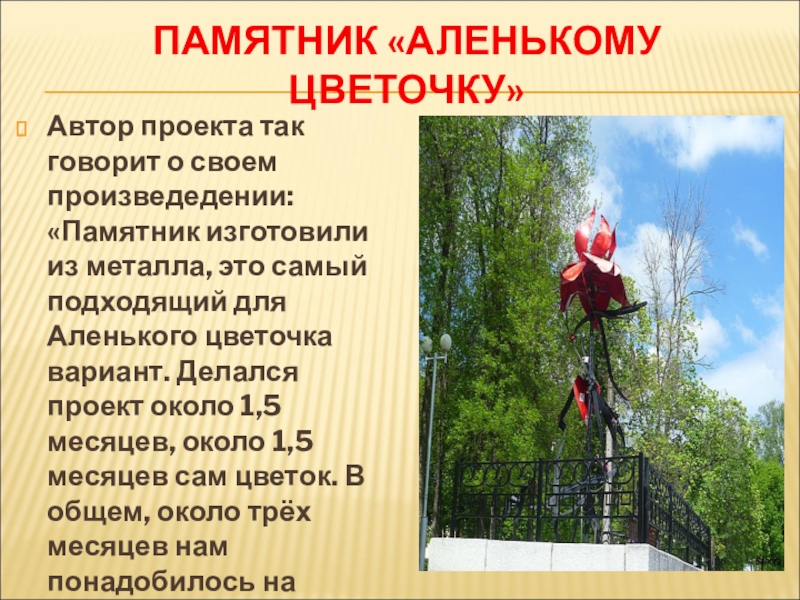 Слайд 20ПАМЯТНИК «АЛЕНЬКОМУ ЦВЕТОЧКУ»