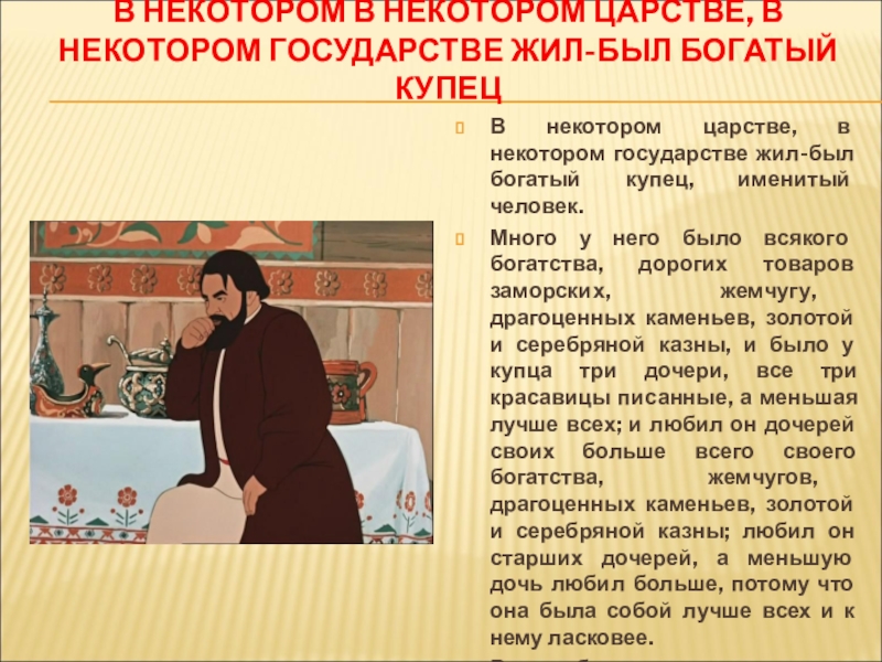 Слайд 4В НЕКОТОРОМ В НЕКОТОРОМ ЦАРСТВЕ, В НЕКОТОРОМ ГОСУДАРСТВЕ ЖИЛ-БЫЛ БОГАТЫЙ КУПЕЦ