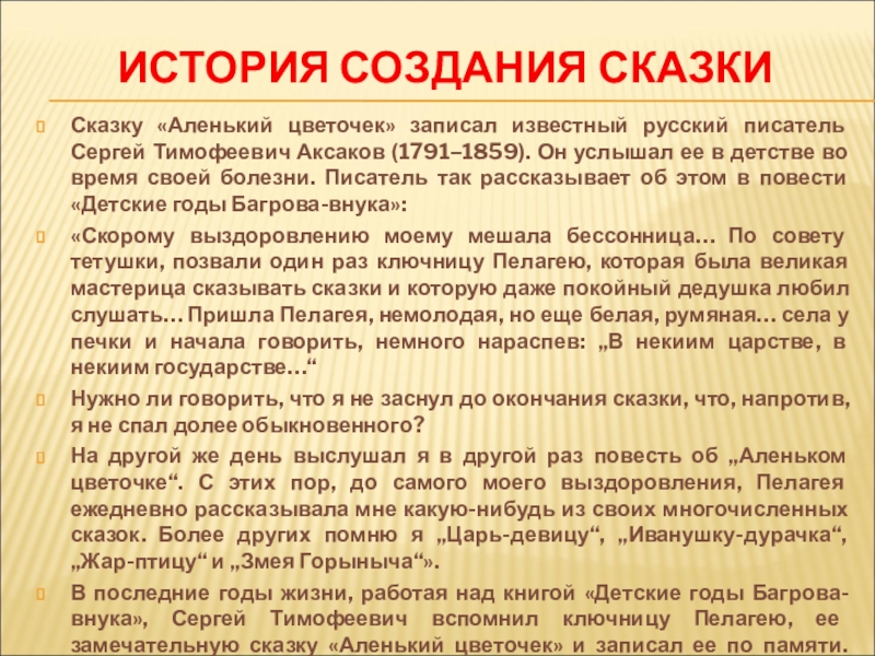 В последние годы жизни, работая над книгой «Детские годы Багрова-внука», Сергей Тимофеевич вспомнил ключницу Пелагею, ее замечательную сказку «Аленький цветочек» и записал ее по памяти. Впервые она была напечатана в 1858 году и с тех пор стала у нас любимой сказкой.