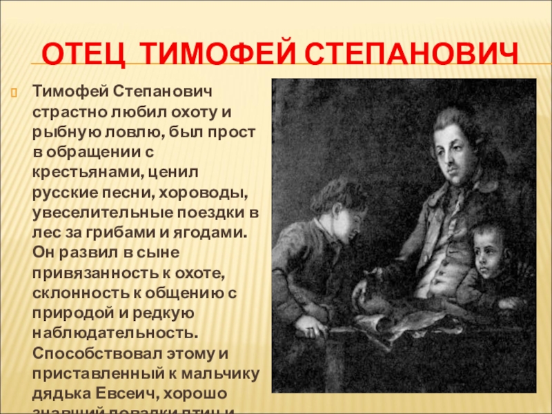 прост в обращении с крестьянами, ценил русские песни, хороводы, увеселительные поездки в лес за грибами и ягодами. Он развил в сыне привязанность к охоте, склонность к общению с природой и редкую наблюдательность. Способствовал этому и приставленный к мальчику дядька Евсеич, хорошо знавший повадки птиц и зверей.