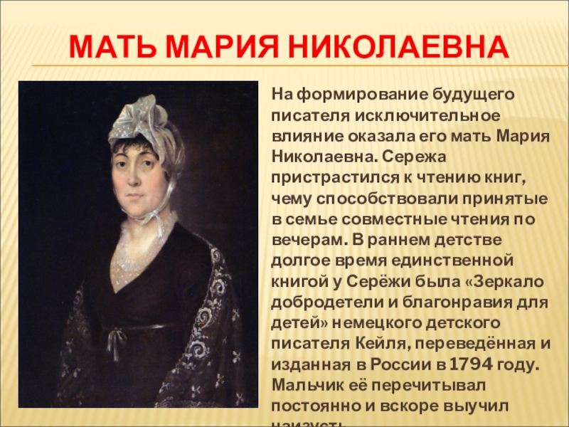 Мария Николаевна. Сережа пристрастился к чтению книг, чему способствовали принятые в семье совместные чтения по вечерам. В раннем детстве долгое время единственной книгой у Серёжи была «Зеркало добродетели и благонравия для детей» немецкого детского писателя Кейля, переведённая и изданная в России в 1794 году. Мальчик её перечитывал постоянно и вскоре выучил наизусть.