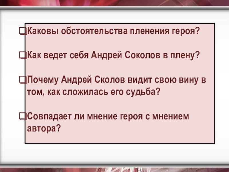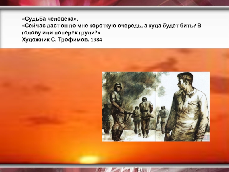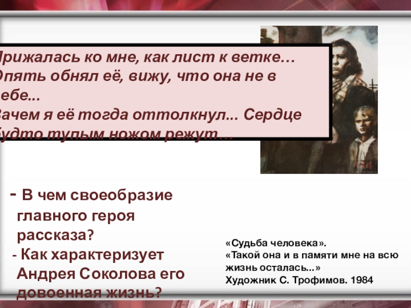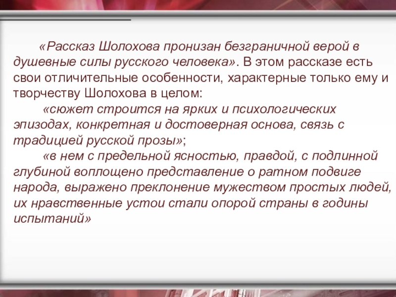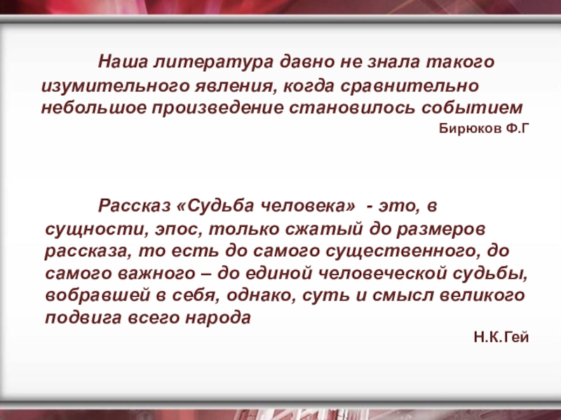 Рассказ «Судьба человека» - это, в сущности, эпос, только сжатый до размеров рассказа, то есть до самого существенного, до самого важного – до единой человеческой судьбы, вобравшей в себя, однако, суть и смысл великого подвига всего народа