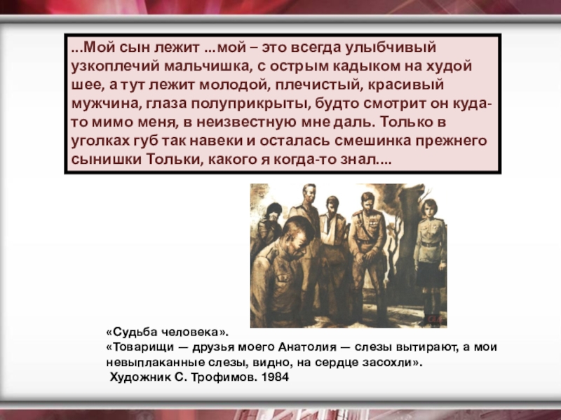 ...Мой сын лежит ...мой – это всегда улыбчивый узкоплечий мальчишка, с острым кадыком на худой шее, а тут лежит молодой, плечистый, красивый мужчина, глаза полуприкрыты, будто смотрит он куда-то мимо меня, в неизвестную мне даль. Только в уголках губ так навеки и осталась смешинка прежнего сынишки Тольки, какого я когда-то знал....