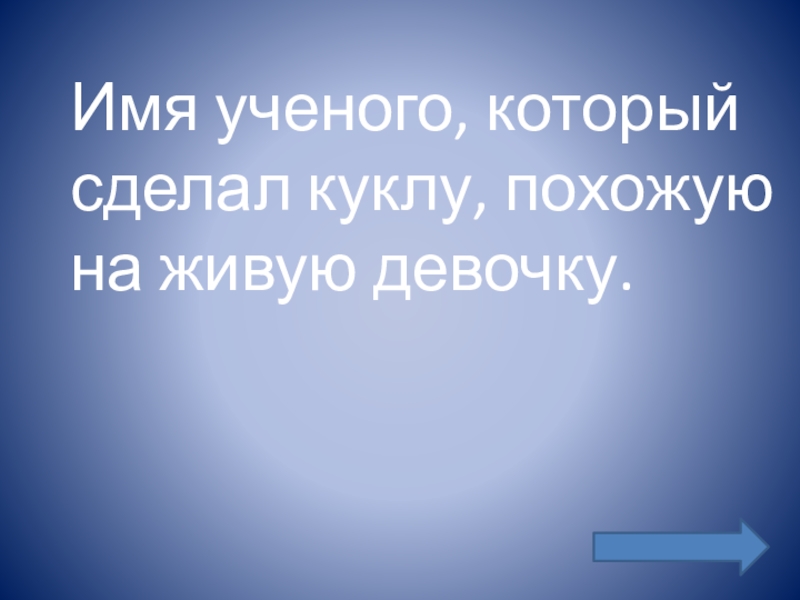 Слайд 11Имя ученого, который сделал куклу, похожую на живую девочку.