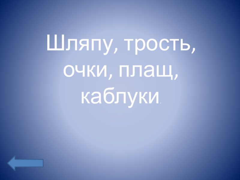 Слайд 34Шляпу, трость, очки, плащ, каблуки.