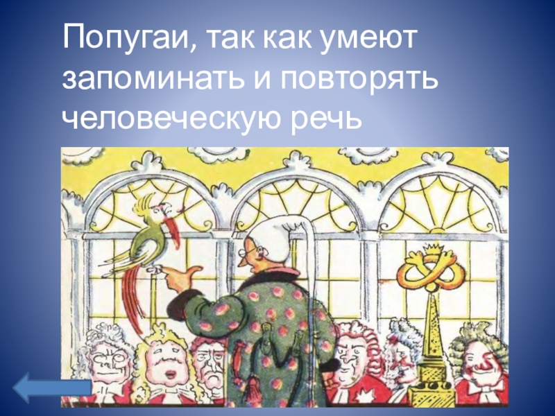 Слайд 44Попугаи, так как умеют запоминать и повторять человеческую речь