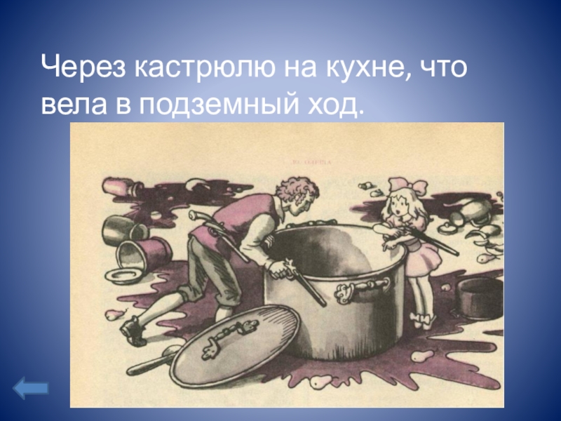 Слайд 66Через кастрюлю на кухне, что вела в подземный ход.