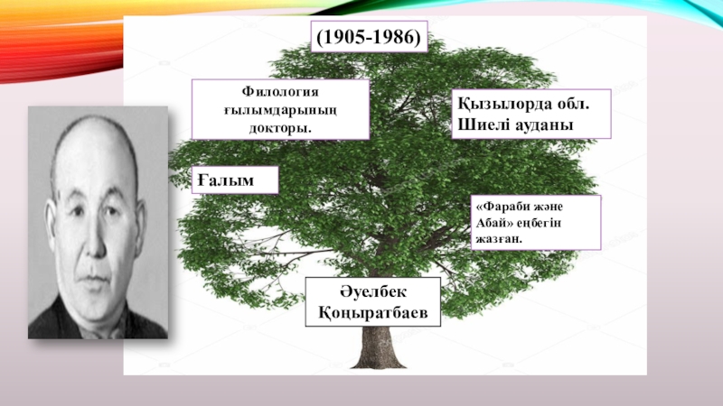 Әуелбек ҚоңыратбаевҒалым Филология ғылымдарының докторы. (1905-1986)Қызылорда обл. Шиелі ауданы«Фараби және Абай» еңбегін жазған.