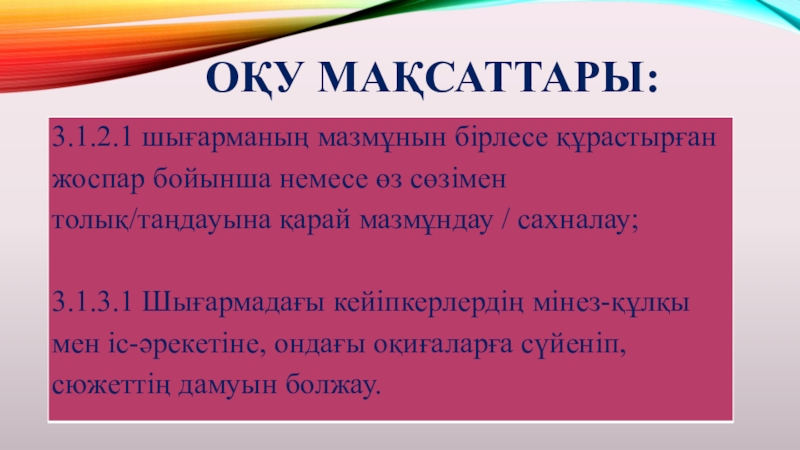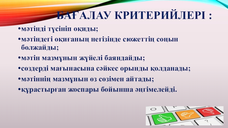 Бағалау критерийлері :мәтінді түсініп оқиды;мәтіндегі оқиғаның негізінде сюжеттің соңын болжайды;мәтін мазмұнын жүйелі баяндайды;сөздерді мағынасына сәйкес орынды қолданады;мәтіннің