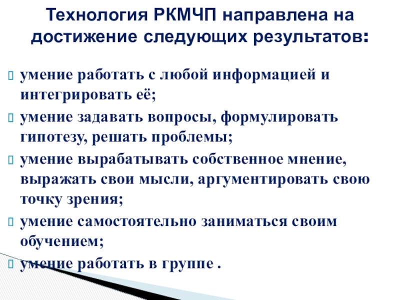 Технология РКМЧП направлена на достижение следующих результатов: