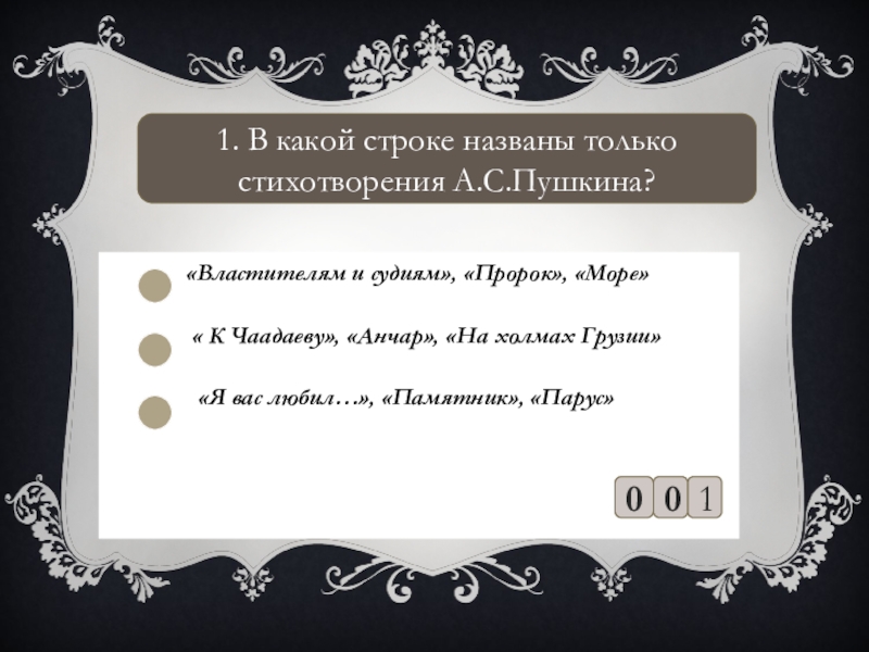 1. В какой строке названы только стихотворения А.С.Пушкина?