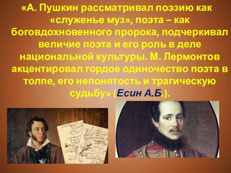 боговдохновенного пророка, подчеркивал величие поэта и его роль в деле национальной культуры. М. Лермонтов акцентировал гордое одиночество поэта в толпе, его непонятость и трагическую судьбу» (Есин А.Б.).
