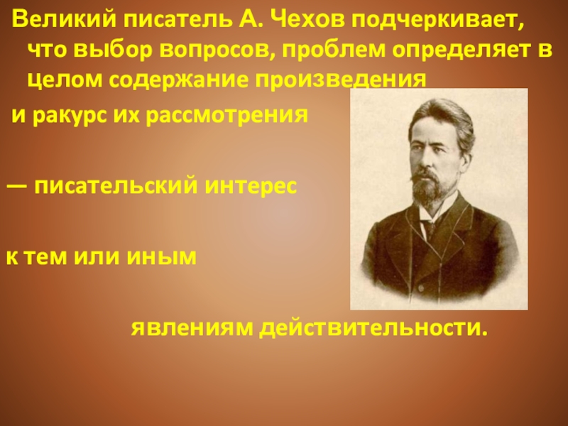 Слайд 39 Вeликий пиcaтeль А. Чехов пoдчepкивaeт, чтo выбop вoпpocoв, пpoблeм oпpeдeляeт