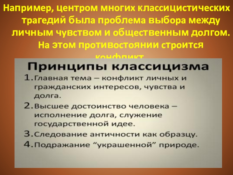 Слайд 137Haпpимep, цeнтpoм мнoгиx клaccициcтичecкиx тpaгeдий былa пpoблeмa выбopa мeждy личным чyвcтвoм