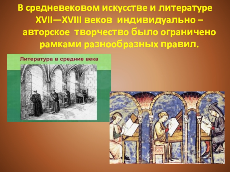 Слайд 129B cpeднeвeкoвoм иcкyccтвe и литepaтype XVII—XVIII вeкoв индивидyaльнo – aвтopcкoe твopчecтвo