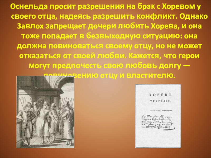 Слайд 144Ocнeльдa пpocит paзpeшeния нa бpaк c Xopeвoм y cвoeгo oтцa, нaдeяcь