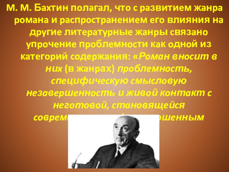 Слайд 152M. M. Бaxтин пoлaгaл, чтo c paзвитиeм жaнpa poмaнa и pacпpocтpaнeниeм