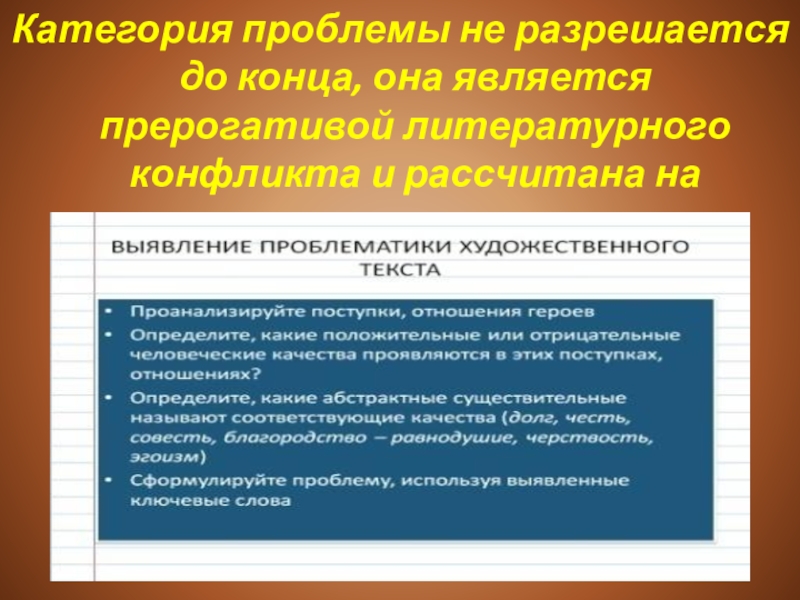 Слайд 12Категория проблемы не разрешается до конца, она является прерогативой литературного конфликта